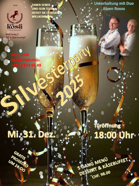 | Mi. 31.12.25 | 19.00 h | CH-4324 Obermumpf AG | Silvesterparty mit 5-Gang Menü im Rest. Rössli. Infos und Reservation unter Tel. 062 873 04 49 |